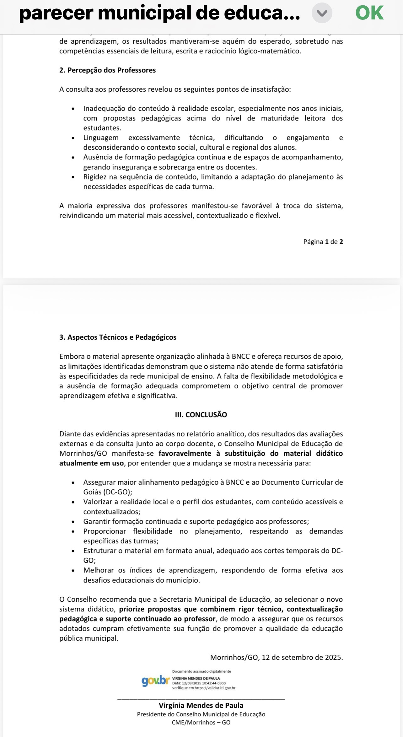 • Parecer do Conselho Municipal de Educação favorável à troca do sistema