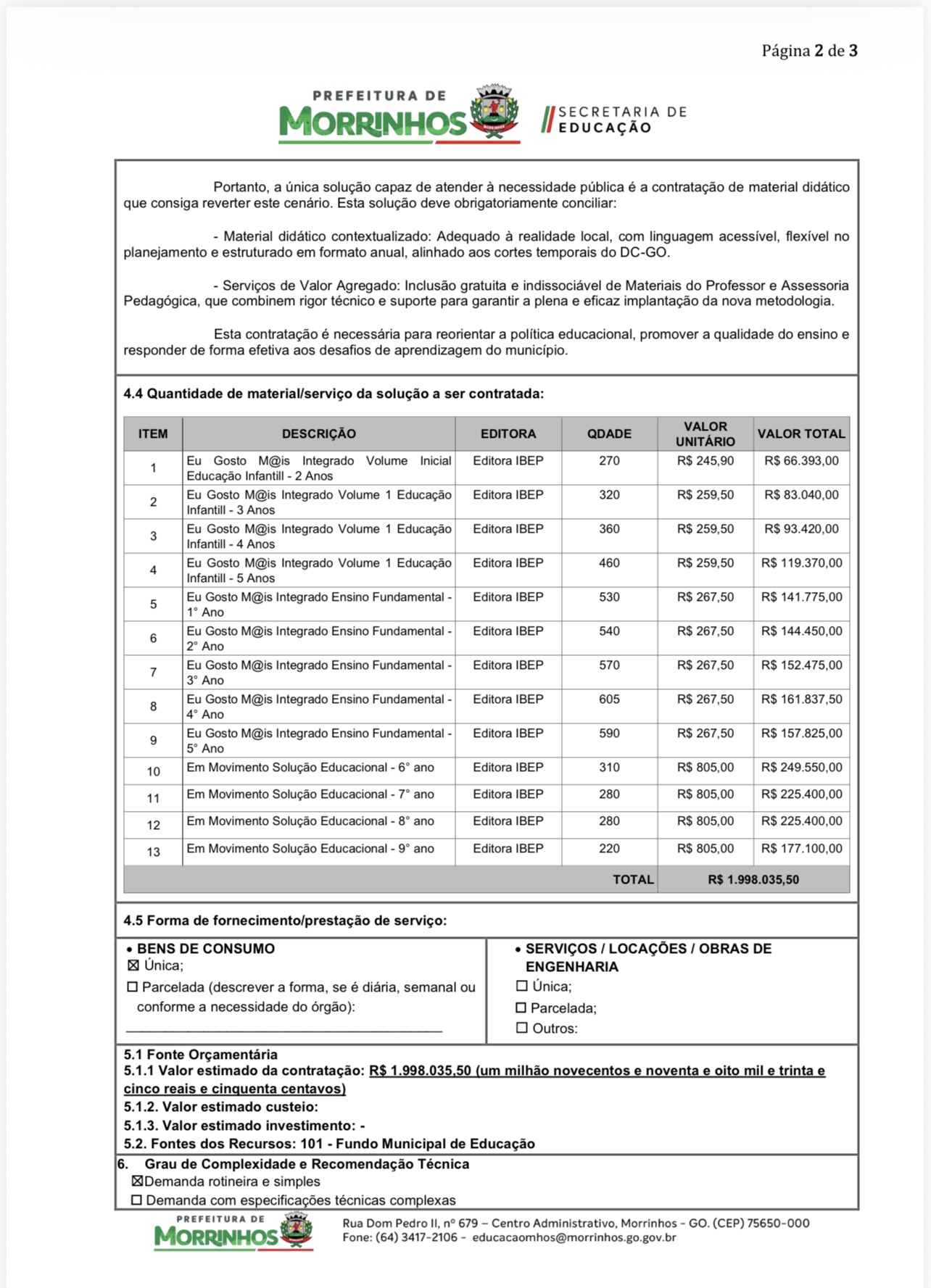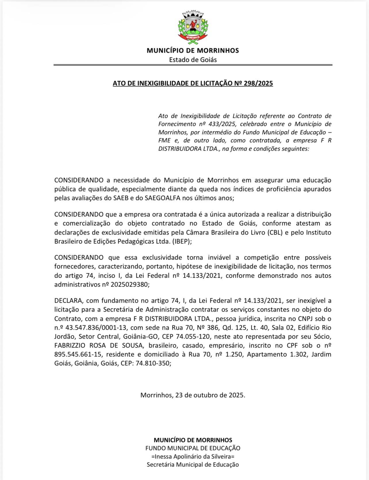 R$ 2 MILHÕES SEM LICITAÇÃO: CONTRATO DE LIVROS EM MORRINHOS EXPÕE MODELO QUE PODE TER DRIBLADO A CONCORRÊNCIA