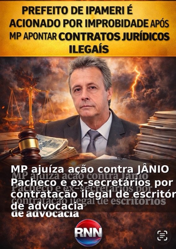 O Ministério Público de Goiás (MPGO), por meio da 3ª Promotoria de Justiça de Ipameri, ajuizou ação de improbidade administrativa contra o atual prefeito do município, Jânio Pacheco, o ex-gestor municipal, ex-secretários e seis escritórios de advocacia, sob acusação de contratações ilegais de assessoria jurídica sem licitação.