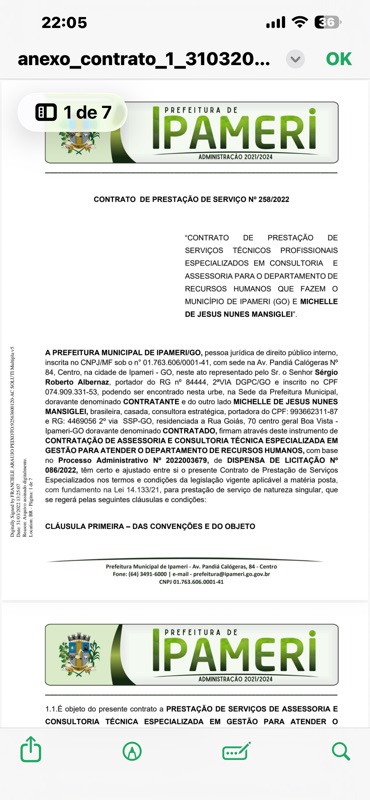 Em março de 2022, a Prefeitura firmou o Contrato nº 258/2022, por dispensa de licitação, com a Sra. Michelle de Jesus Nunes Mansiglei, no valor global de R$ 53.100,00.