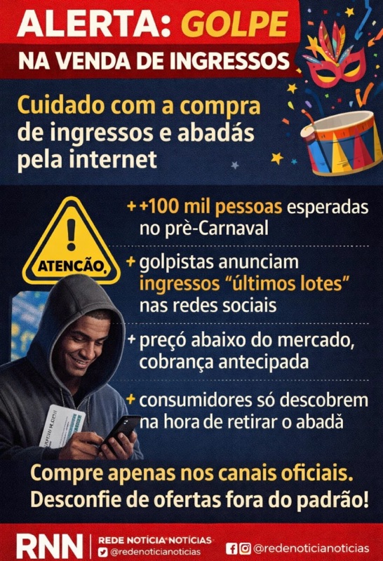 Na prática, trata-se de estelionato digital, crime recorrente em grandes eventos e potencializado pelo volume de pessoas, pela urgência típica do Carnaval e pela falsa sensação de segurança ao negociar pela internet.
