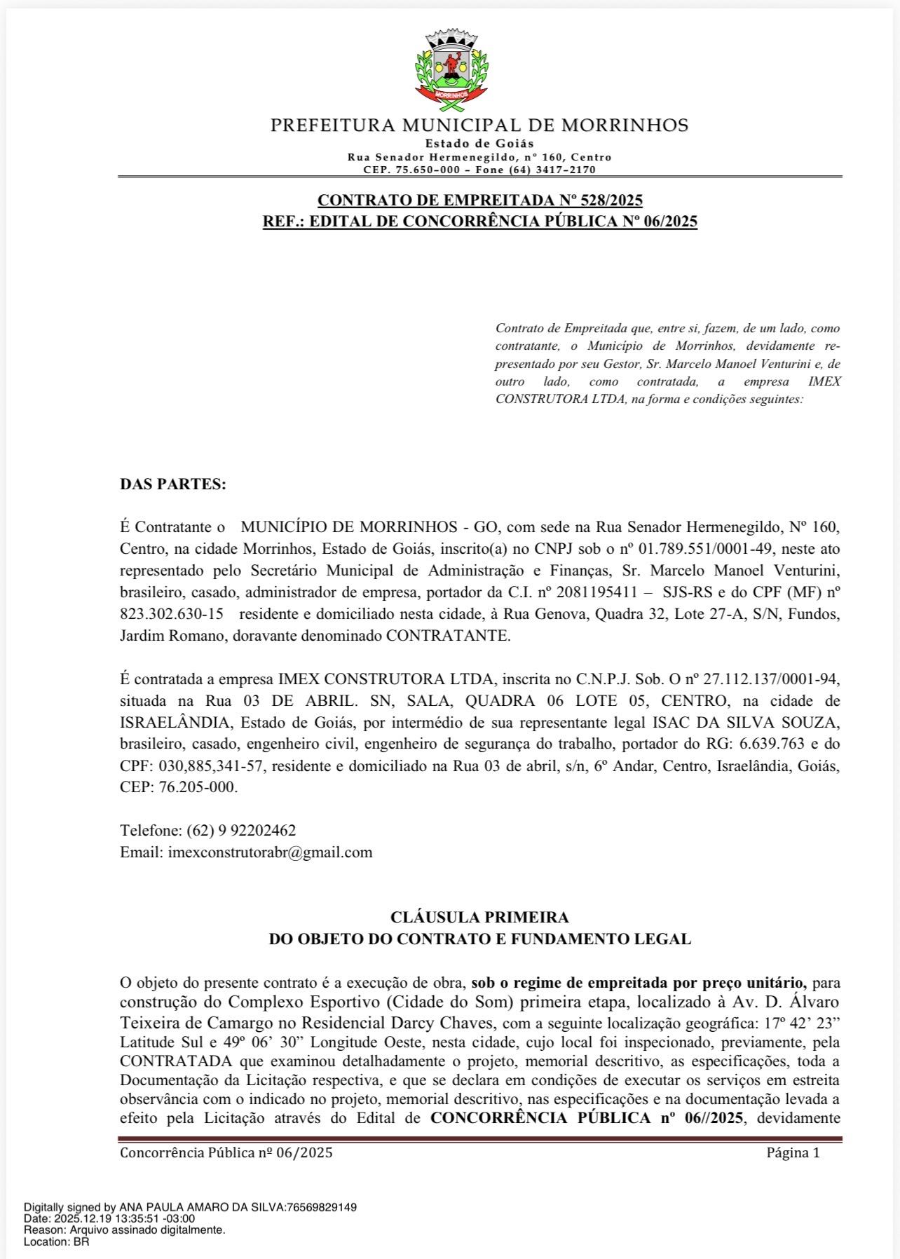 Em Morrinhos, uma obra pública que deveria representar investimento em esporte e lazer começa a levantar questionamentos que vão muito além do concreto e do aço. No centro da história está o Contrato de Empreitada nº 528/2025, firmado entre a Prefeitura de Morrinhos e a empresa IMEX Construtora Ltda, para execução da primeira etapa do Complexo Esportivo “Cidade do Som”, no Residencial Darcy Chaves. O valor global da obra é de R$ 2.359.950,00.