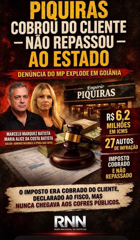 De acordo com a denúncia, os empresários Marcelo Marquez Batista e Maria Alice da Costa Batista, à época sócios-administradores de unidades do Empório Piquiras Ltda., deixaram de recolher, entre 2016 e 2019, mais de R$ 6,2 milhões em ICMS. O dado, por si só, já chama atenção. Mas o ponto central não está apenas no valor.