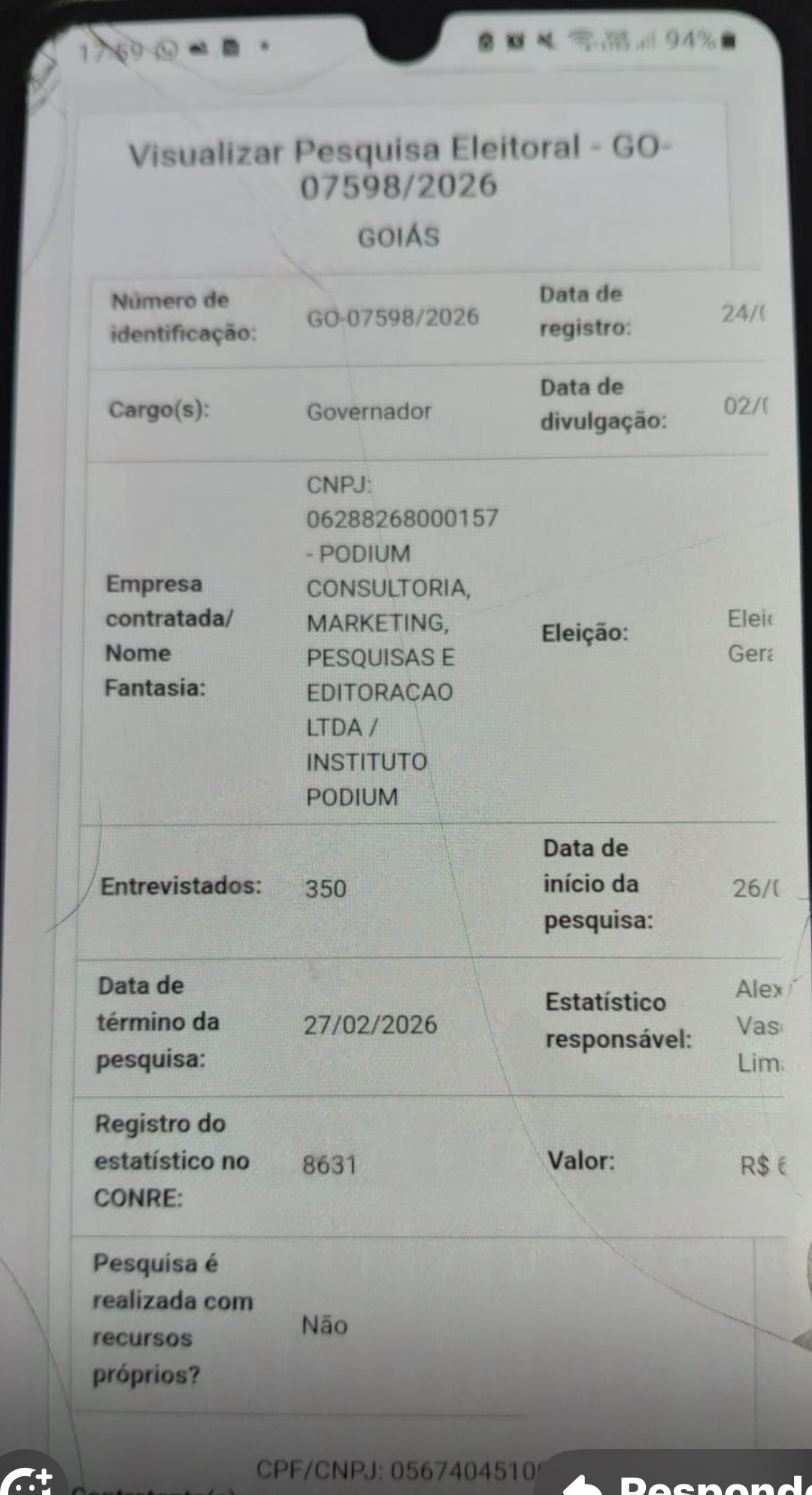 O levantamento está sob o número GO-07598/2026, no Tribunal Superior Eleitoral, foi conduzido pelo Instituto Podium (Podium Consultoria, Marketing, Pesquisas e Editoração Ltda), com 350 entrevistas, realizadas entre os dias 26 e 27 de fevereiro de 2026. Ou seja: é um retrato formal do eleitor de Acreúna e Arantina— e não de Goiás, nem do Brasil.