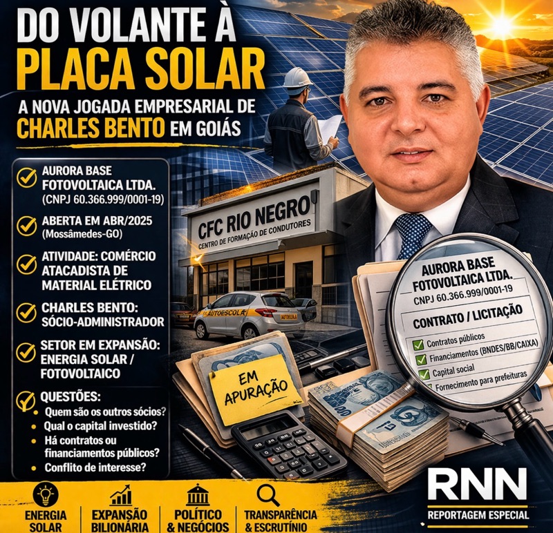 A abertura da Aurora Base Fotovoltaica Ltda., em abril de 2025, no município de Mossâmedes (GO), coloca Charles Bento como sócio-administrador em uma empresa voltada ao comércio atacadista de material elétrico — uma porta de entrada direta para o mercado fotovoltaico.