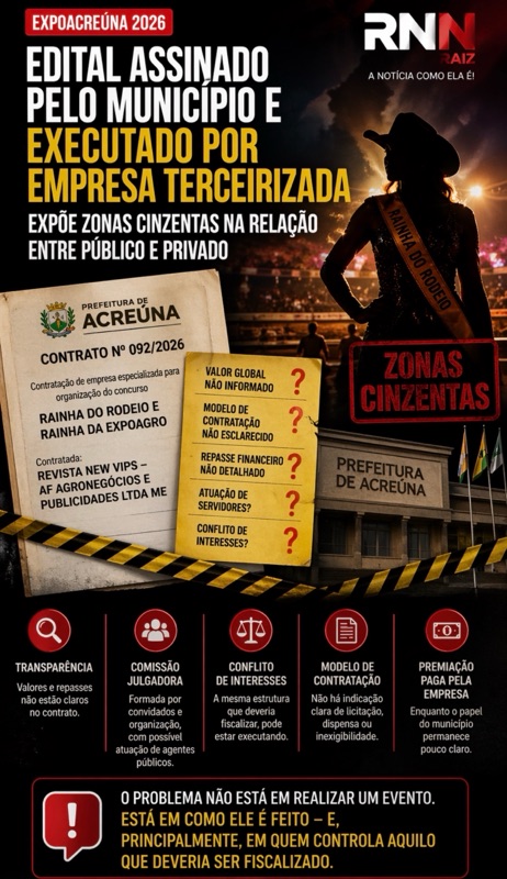 O que deveria ser apenas um concurso festivo dentro da programação da Expoacreúna 2026 começa a revelar um enredo mais complexo — e potencialmente problemático — sob o ponto de vista jurídico e administrativo. Documentos oficiais mostram que a Prefeitura de Acreúna firmou o Contrato nº 092/2026 com a empresa Revista New Vips – AF Agronegócios e Publicidades LTDA ME para a organização do concurso Rainha do Rodeio e Rainha da Expoagro. Até aqui, nada incomum. O problema surge quando se analisa como esse arranjo foi estruturado — e o que ficou de fora.