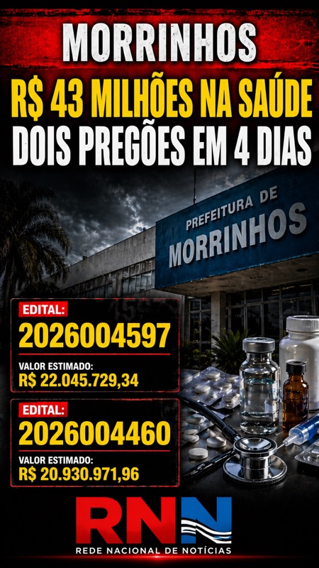 O primeiro procedimento, publicado em 13 de abril de 2026, projeta um gasto estimado de R$ 22.045.729,34 para compra de materiais de consumo hospitalar e odontológico. Quatro dias depois, em 17 de abril, um novo processo foi aberto, desta vez com previsão de R$ 20.930.971,96, voltado ao fornecimento parcelado de medicamentos ao sistema municipal de saúde.
